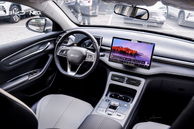 Bên trong khoang cabin, BYD Seal 5 hướng đến phong cách tối giản nhưng cao cấp. Trung tâm bảng điều khiển là màn hình cảm ứng xoay kích thước lớn – một trong những điểm nhấn đặc trưng của xe BYD. Giao diện thân thiện, dễ thao tác và hỗ trợ nhiều tính năng kết nối thông minh.