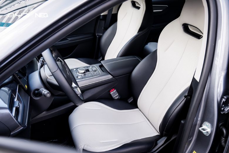 Phần đầu xe nổi bật với cụm đèn pha LED sắc sảo, dải đèn định vị ban ngày tạo hiệu ứng thị giác mạnh mẽ. Lưới tản nhiệt được tối giản nhờ đặc thù xe điện, mang lại cảm giác liền mạch và tinh gọn. Hông xe thiết kế khí động học, với đường gân dập nổi tạo điểm nhấn thể thao.